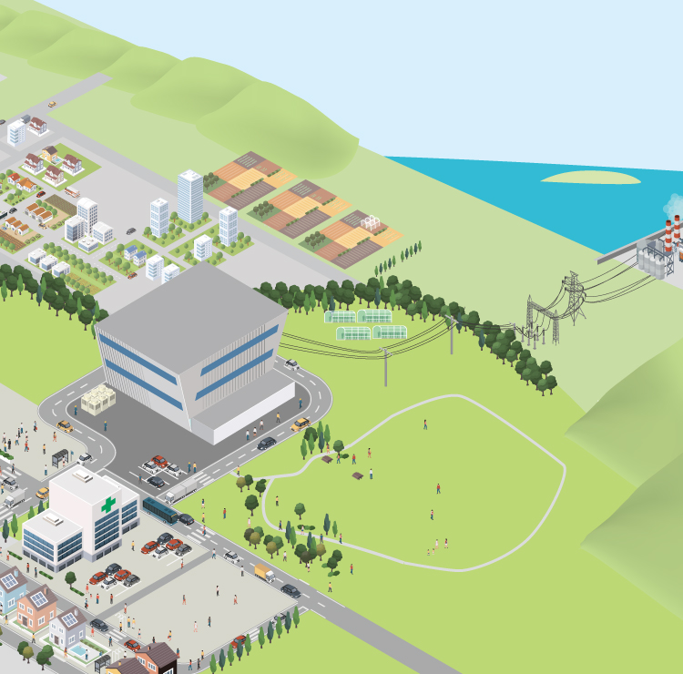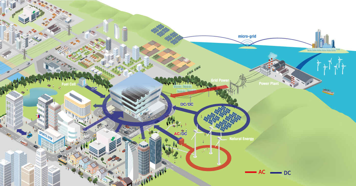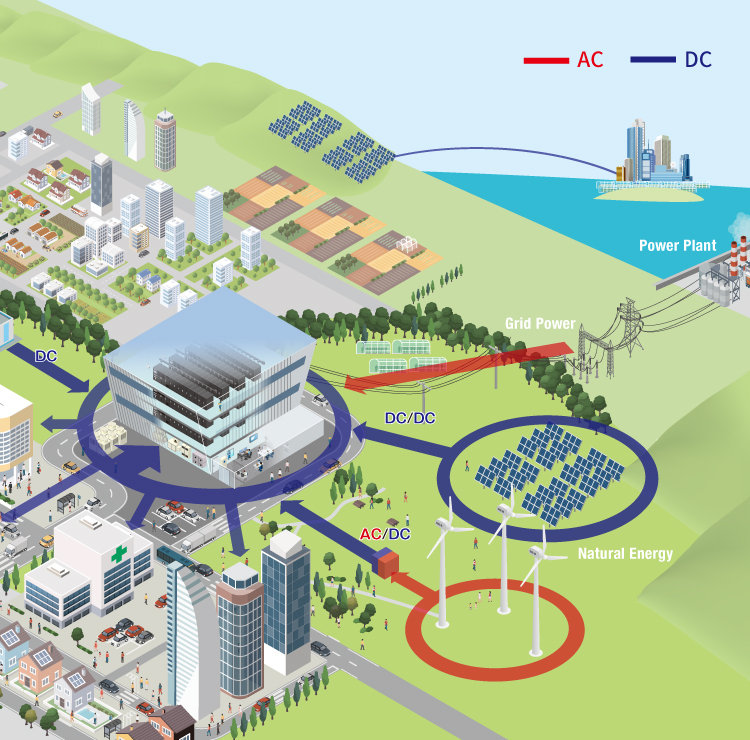 長期間にわたり安定的に給電し続ける直流給電システムは、地球温暖化対策への貢献や経済活動の活性化のため、将来的な電力の安定供給を追求した未来にふさわしいカタチです。省エネに、最も効率的なのは電力ロスを削減すること!